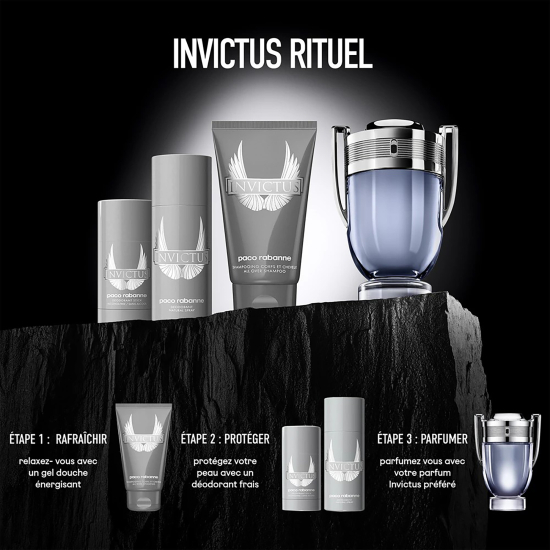 Uz izvrsnu zaštitu od neugodnih mirisa i nevjerojatnu mekoću kože, ovaj dezodorans ima snažan i upečatljiv muževan miris. Proizvodi iz Invictus kolekcije ispunjeni su energičnim vibracijama te se otvaraju snažnim morskim notama i citrusima grejpfrutom i mandarinom. U srcu mrirsa se nalaze lovor i jasmin, dok sigurnu i ugodnu bazu čine guaiac drvo, patchouli, mahovina i sivi amber.