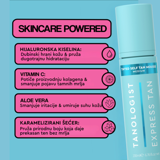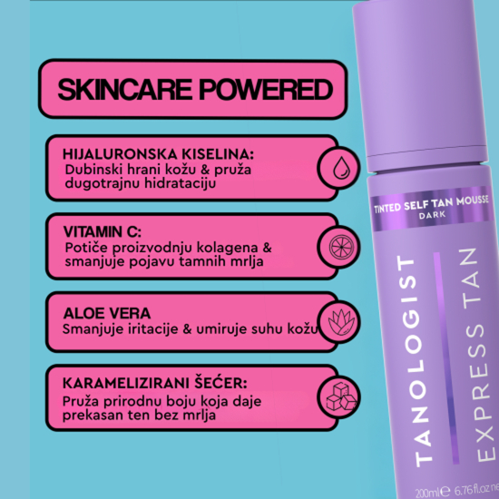 Ne ostavlja crte i tragove na odjeći. Za nove i iskusne korisnike, lako se nanosi i stapa. Tanologist Tinted Mousse dolazi u Medium i Dark nijansi i koži daje besprijekoran izgled i rezultate prilagođene samo tebi. U formulaciji ima hijaluronsku kiselinu, vitamin C i aloa veru – rezultat je instant preplanula, nahranjena i sjajna koža. Preplanuli ten traje i do 7 dana.